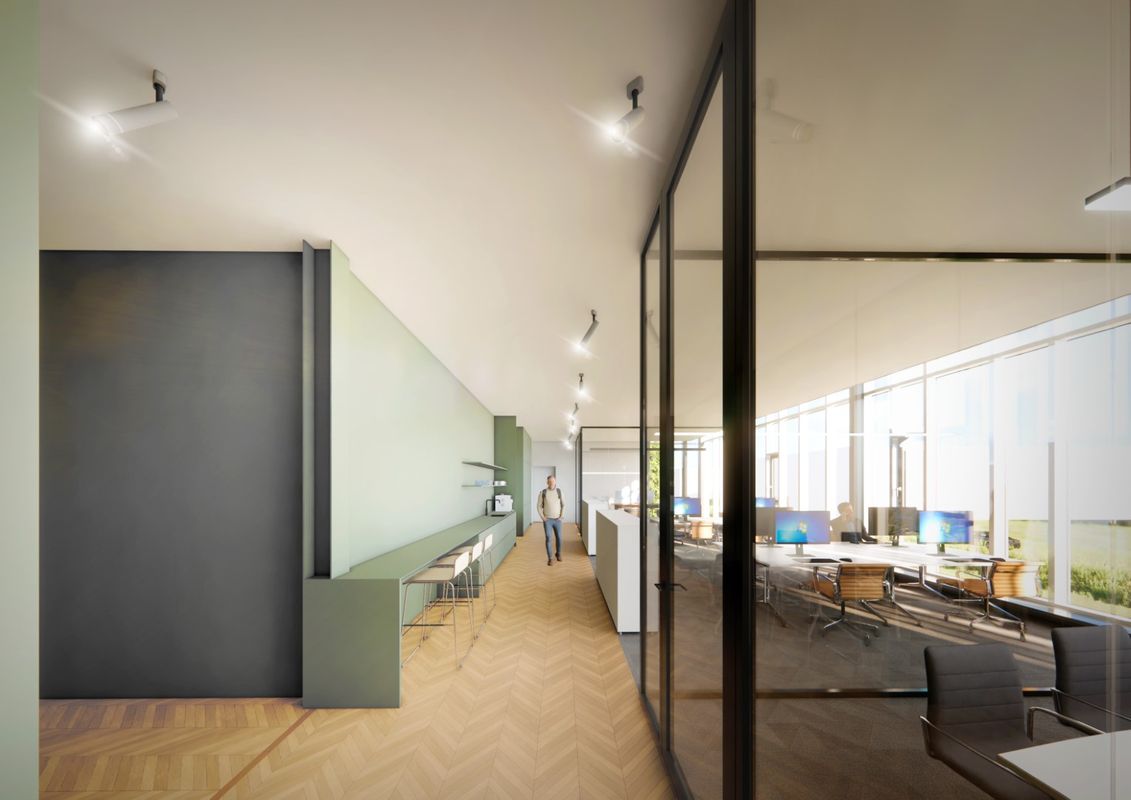 - Scheidingswand tussen het kantoor en de bedrijfsruimte uitgevoerd in sandwichpanelen;