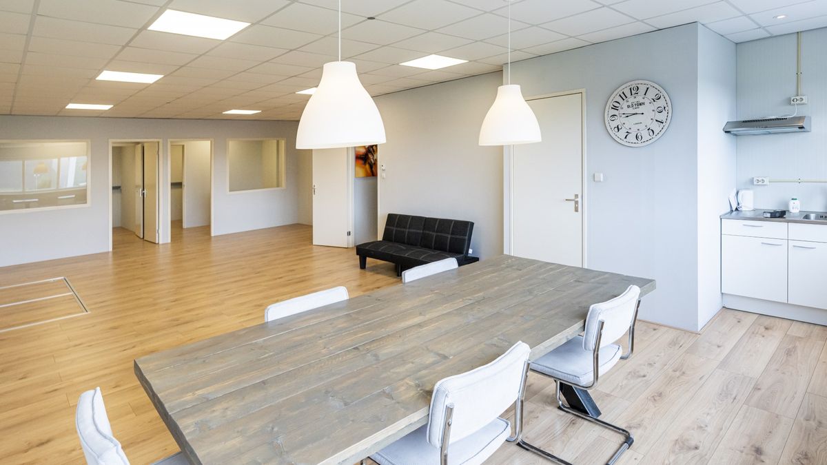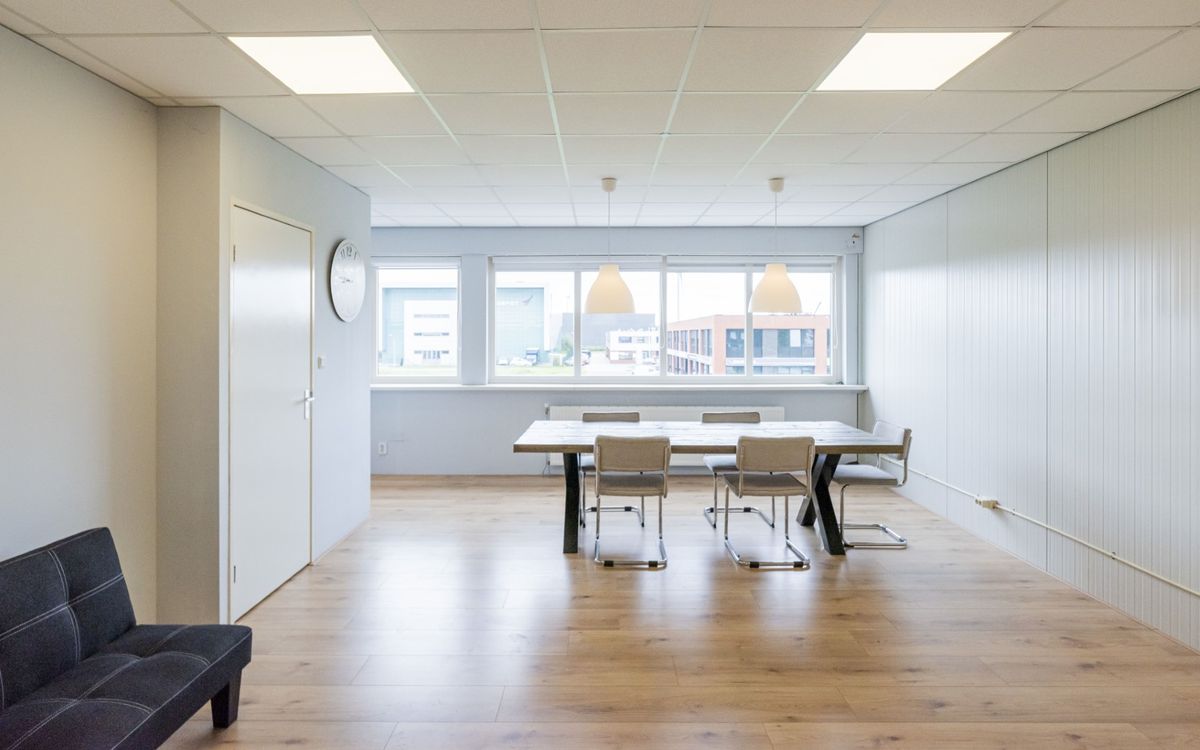 - Kantoorruimte met systeemplafond met verlichting, kabelgoten met bekabeling, verwarming met radiatoren;