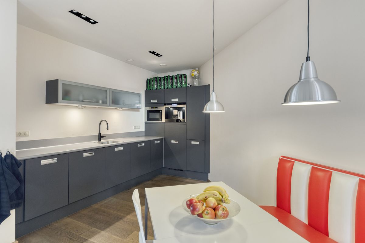- Moderne pantry in antraciet kleurstelling en inbouwapparatuur;