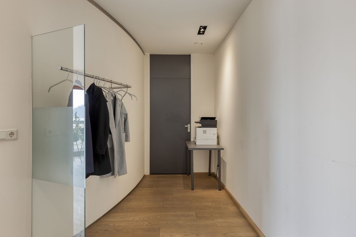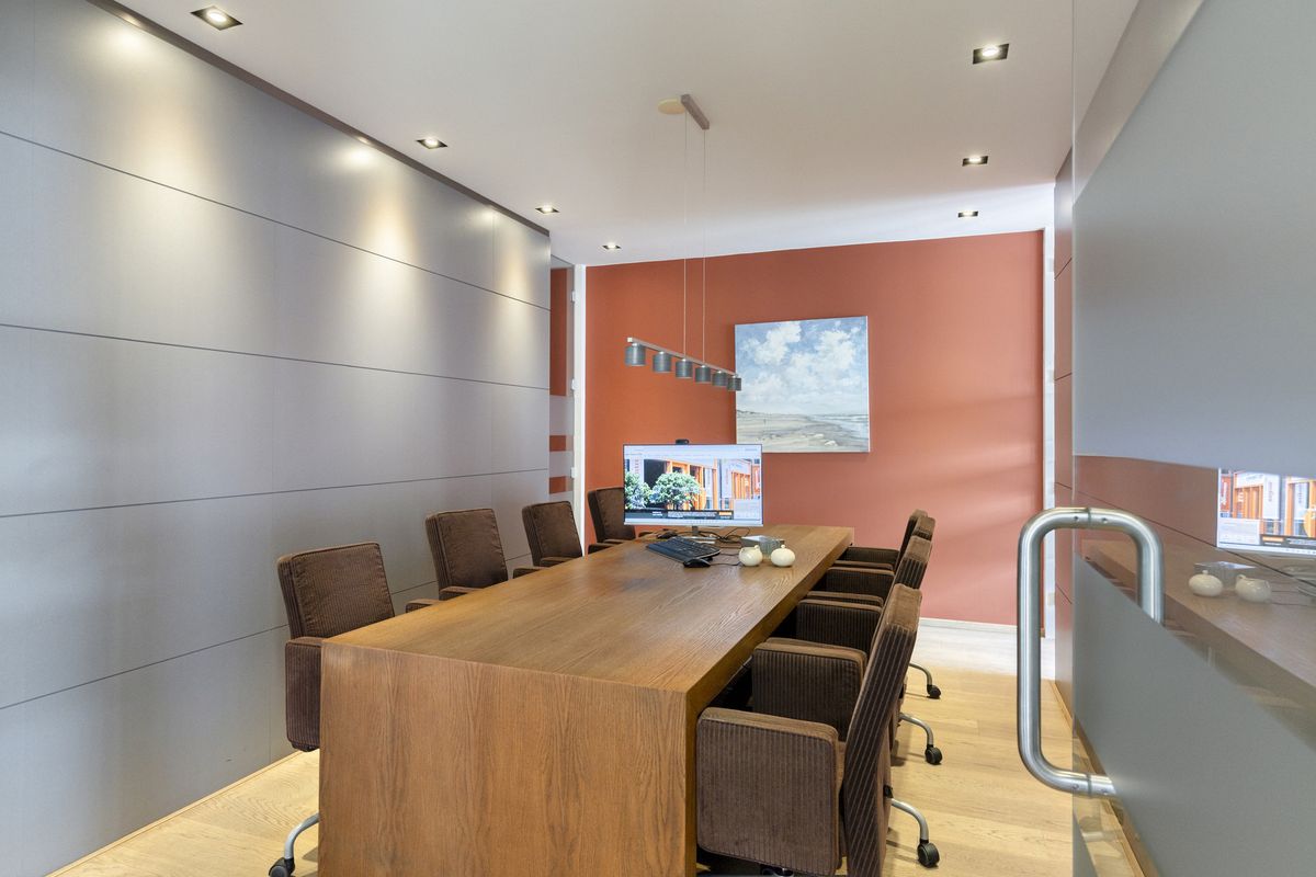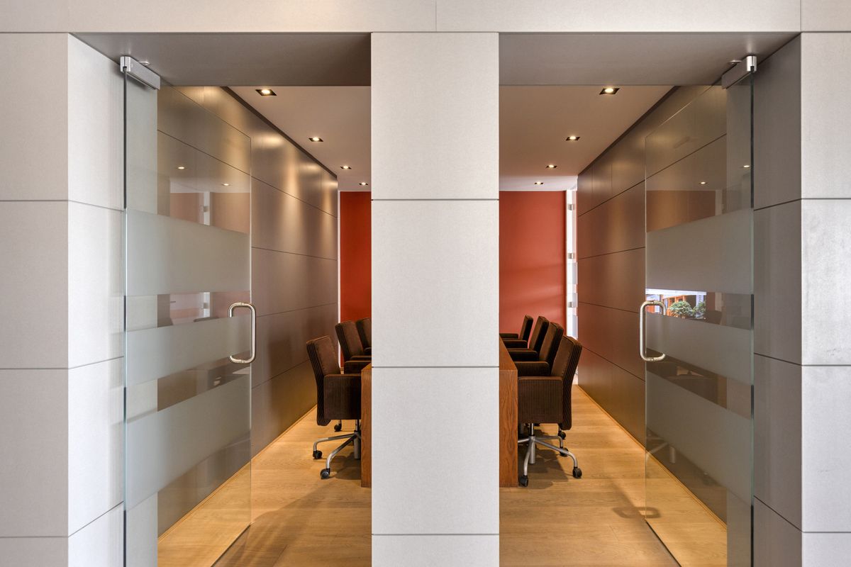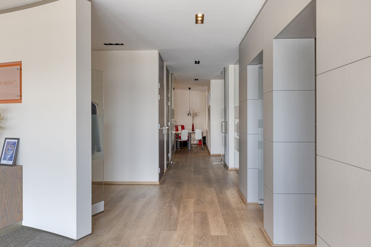 - Binnendeuren van glas bij de kantoor en spreekkamers gecombineerd met stompe houten deuren bij de overige vertrekken;
